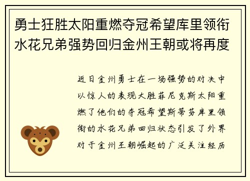 勇士狂胜太阳重燃夺冠希望库里领衔水花兄弟强势回归金州王朝或将再度崛起