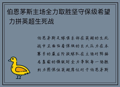 伯恩茅斯主场全力取胜坚守保级希望 力拼英超生死战