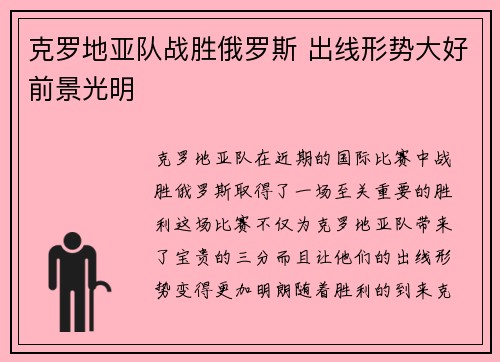 克罗地亚队在近期的国际比赛中战胜俄罗斯,取得了一场至关重要的胜利。这场比赛不仅为克罗地亚队带来了宝贵的三分,而且让他们的出线形势变得更加明朗。随着胜利的到来,克罗地亚队的士气大幅提升,出线前景也因此更加光明。本文将从四个方面来详细分析克罗地...