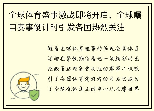 全球体育盛事激战即将开启,全球瞩目赛事倒计时引发各国热烈关注