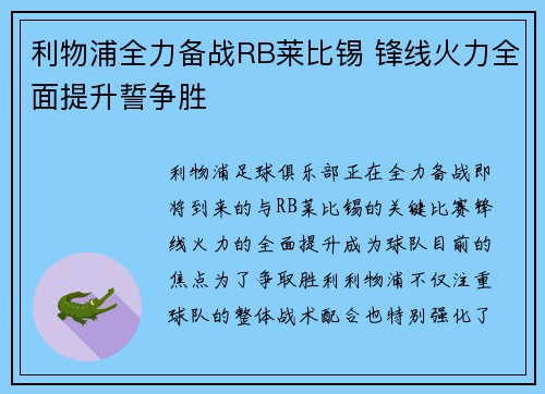 利物浦足球俱乐部正在全力备战即将到来的与RB莱比锡的关键比赛,锋线火力的全面提升成为球队目前的焦点。为了争取胜利,利物浦不仅注重球队的整体战术配合,也特别强化了进攻端的实力。球队的锋线人员如萨拉赫、努涅斯等球员,已经在近期的训练中表现出色,...