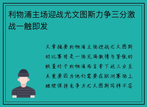 利物浦主场迎战尤文图斯力争三分激战一触即发