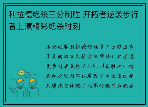 本场比赛,利拉德的绝杀三分球成为了关键的决定性时刻,帮助开拓者逆袭步行者,最终以116-114获胜。这一精彩绝杀时刻不仅展现了利拉德的超凡球技,也体现了比赛的激烈和戏剧性。在比赛的最后时刻,步行者在主场领先,仿佛已经看到胜利的曙光。然而,利...