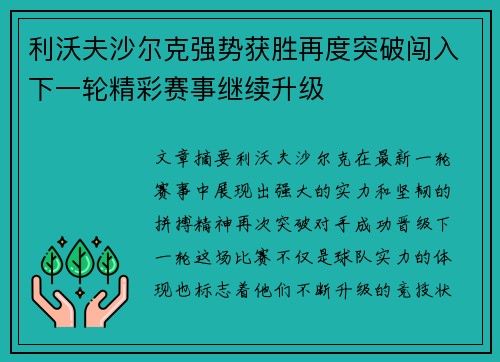 利沃夫沙尔克强势获胜再度突破闯入下一轮精彩赛事继续升级