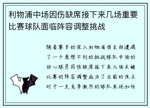 利物浦中场因伤缺席接下来几场重要比赛球队面临阵容调整挑战