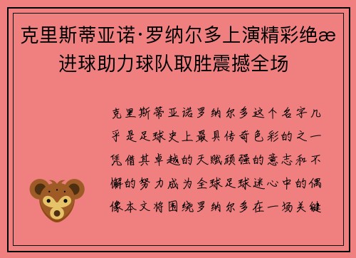 克里斯蒂亚诺·罗纳尔多,这个名字几乎是足球史上最具传奇色彩的之一,凭借其卓越的天赋、顽强的意志和不懈的努力,成为全球足球迷心中的偶像。本文将围绕罗纳尔多在一场关键比赛中上演精彩绝杀进球的震撼时刻,分析他如何通过个人实力帮助球队取得胜利,并引...