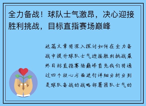 这篇文章将深入探讨如何在全力备战中提升球队士气,迎接胜利挑战,最终目标直指赛场巅峰。首先,我们将通过四个核心方面进行详细分析,分别是:球队备战的战略部署、团队士气的激发与提升、个体运动员的心理调节、以及如何在实战中展现团队的协作与执行力。每...