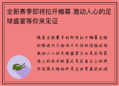 随着全新赛季的即将拉开帷幕,全球的球迷们已经迫不及待地迎接这场激动人心的足球盛宴。无论是在绿茵场上的技术较量,还是在看台上的热烈氛围,足球始终是全世界最受欢迎的体育项目之一。本篇文章将从四个方面详细阐述即将开始的赛季,带领读者一起期待这场视...