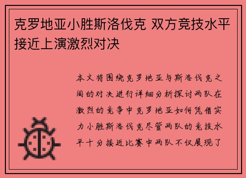 本文将围绕克罗地亚与斯洛伐克之间的对决进行详细分析,探讨两队在激烈的竞争中,克罗地亚如何凭借实力小胜斯洛伐克,尽管两队的竞技水平十分接近。比赛中,两队不仅展现了高水平的竞技状态,也在策略、体能、技术、心态等多个方面展开了激烈较量。通过对这场...