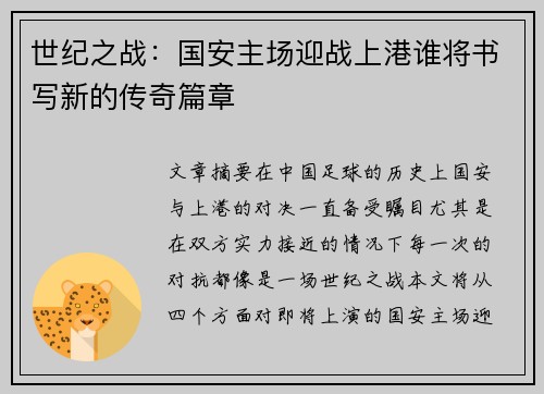 文章摘要:在中国足球的历史上,国安与上港的对决一直备受瞩目,尤其是在双方实力接近的情况下,每一次的对抗都像是一场世纪之战。本文将从四个方面对即将上演的“国安主场迎战上港,谁将书写新的传奇篇章”这一主题进行详细阐述。首先,从两队的历史恩怨谈起...