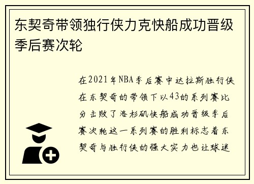 在2021年NBA季后赛中,达拉斯独行侠在东契奇的带领下,以4-3的系列赛比分击败了洛杉矶快船,成功晋级季后赛次轮。这一系列赛的胜利,标志着东契奇与独行侠的强大实力,也让球迷对这位年轻的超级巨星刮目相看。东契奇的表现无疑是球队晋级的最大亮点...