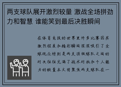 两支球队展开激烈较量 激战全场拼劲力和智慧 谁能笑到最后决胜瞬间