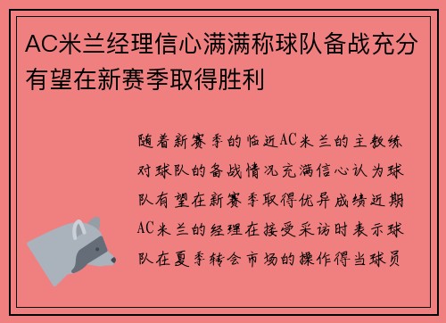AC米兰经理信心满满称球队备战充分有望在新赛季取得胜利